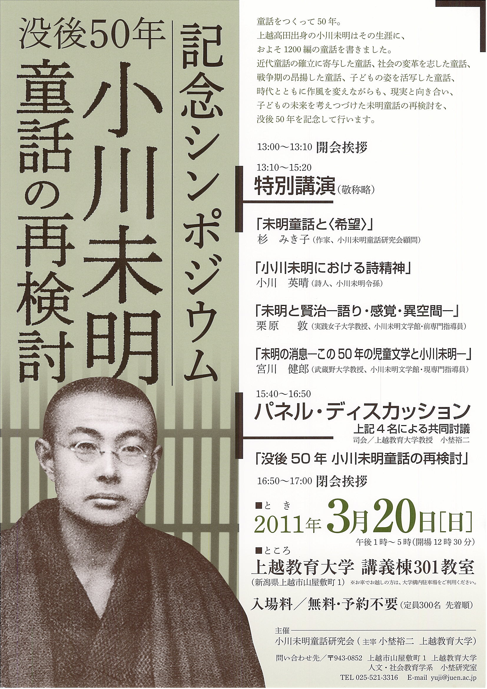 | /11.03.15/ このたびの地震で被災された方々に心からお見舞いを申し上げます。 「没後50年小川未明童話の再検討」シンポジウムは、現在のところ、開催の方向で準備を進めておりますが、余震その他、計画停電、JRの運行状況の変化により、今後、開催をとりやめざるをえない状況になるかもしれません。開催の有無については、このホームページにおきまして、あらためてお知らせ申し上げます。 |